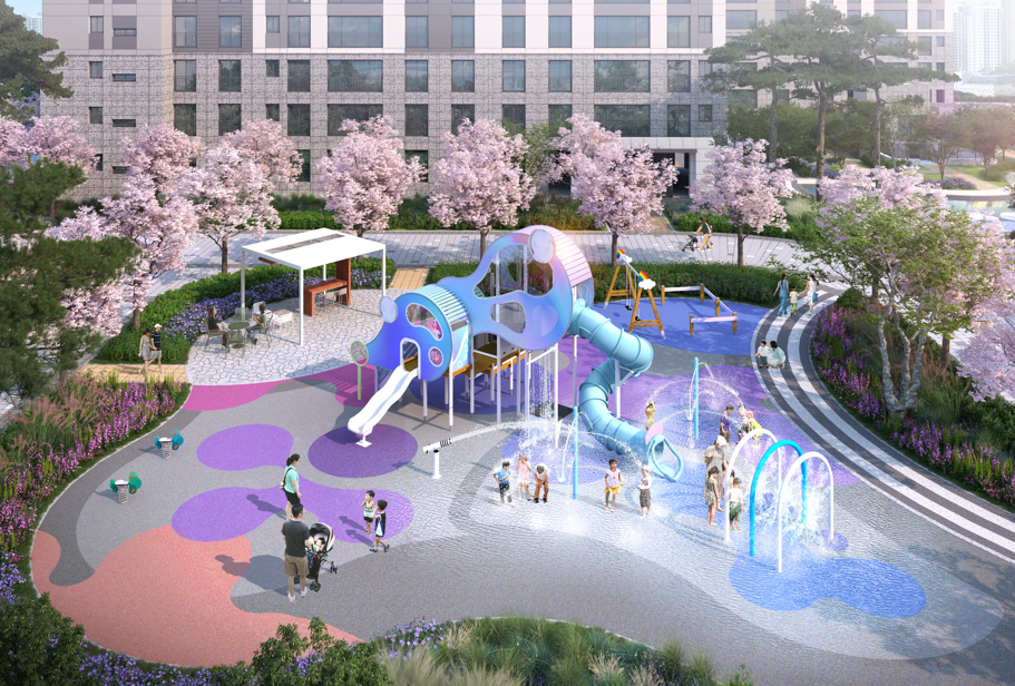 다양한 테마 놀이터와 물놀이터에서는 (물 테마 놀이터(단지별 1개소)) 부모와 아이,